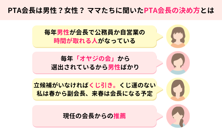 寄せられたコメントを見ると、PTA会長の決まり方にはいくつかのパターンがあることがわかります。