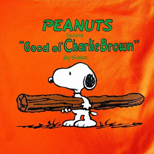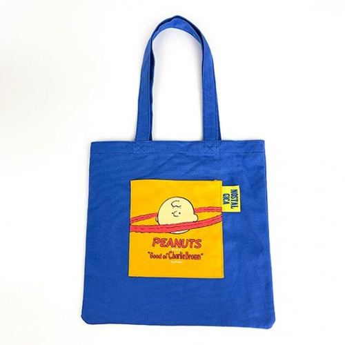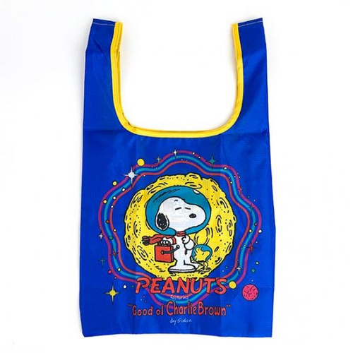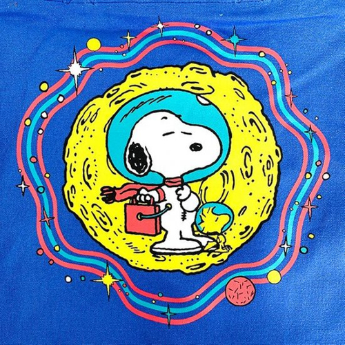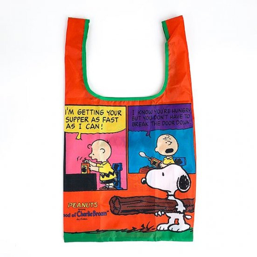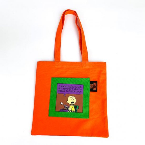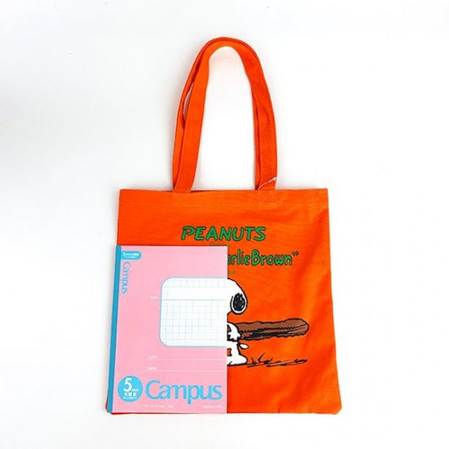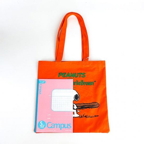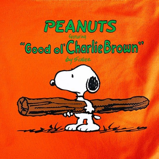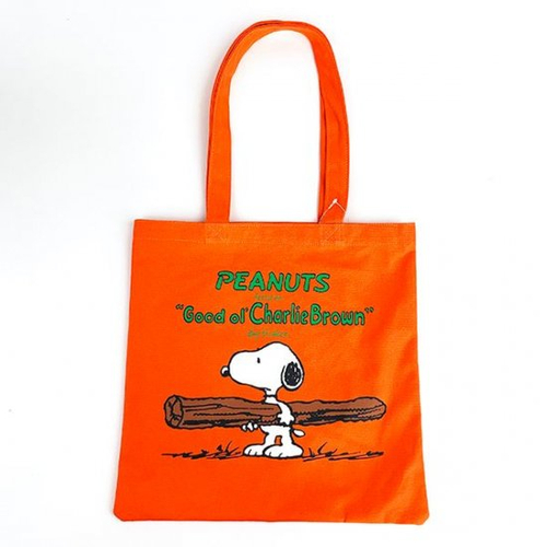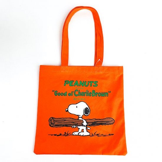 元気カラーのオレンジがきれいな、スヌーピーのトートバッグです。スヌーピーが丸太を運んでいるところがデザインされていて、グリーンの文字も効いています♪