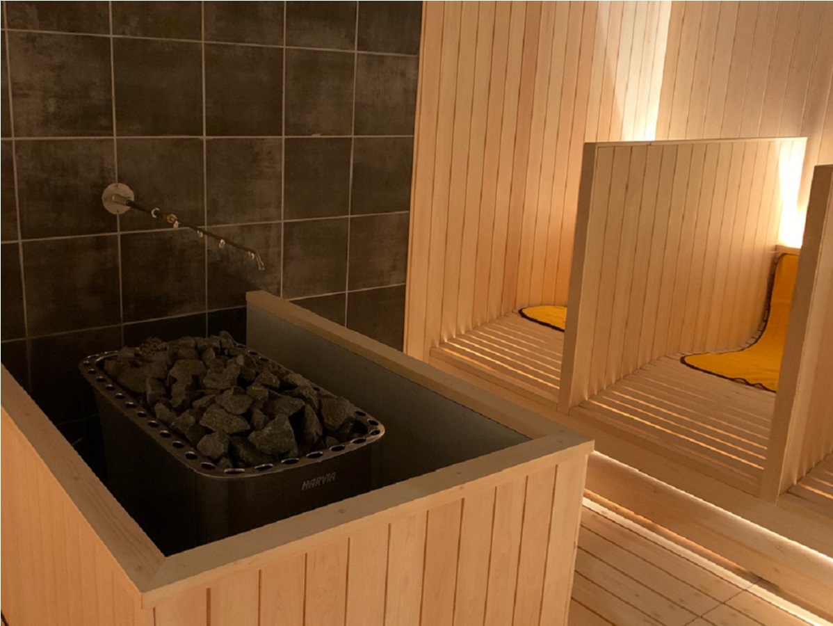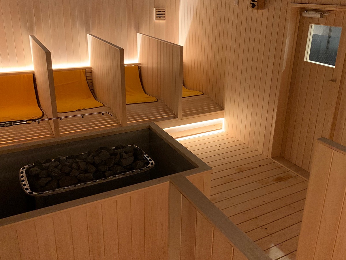 当館のフィンランドサウナは、世界シェアNo.1のHARVIAのサウナヒーターを使用。サウナや水風呂に一部仕切りを設置しているため、他人の目線や接触が気にならない設計となっており、共有サウナでありながらプチソロ活サウナを堪能いただけます。