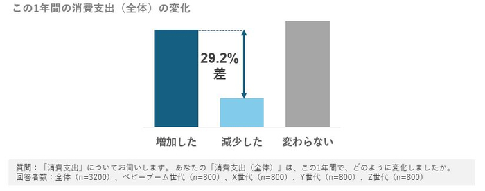過去1年間の消費支出について、増加した層が減少した層を29.2%上回っており、全体的には支出が増加傾向にある。ただし、カテゴリー別の増減では「食料品」は増加する一方、「宝飾品」「預貯金・投資」「交際・遊び」などは大きく減少し、生活の優先度に応じた支出の調整がされていることがわかる。