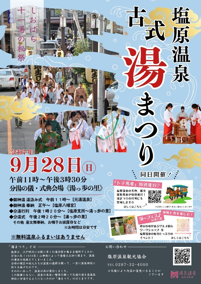 一般社団法人那須塩原市観光局(栃木県那須塩原市関谷448-4)は、塩原温泉を象徴する伝統行事「塩原温泉 古式湯まつり」が2025年9月28日(日)に開催されることをお知らせいたします。