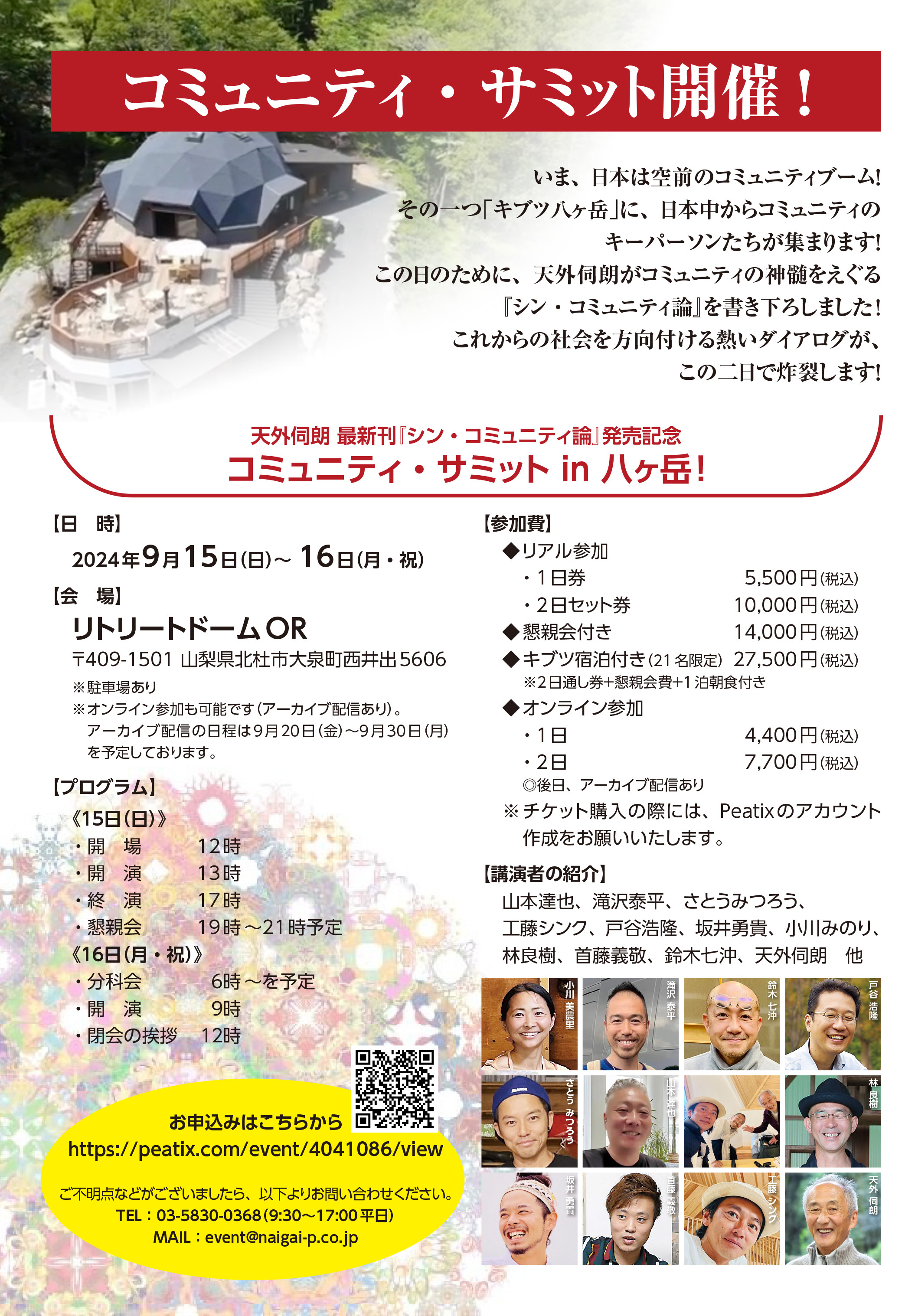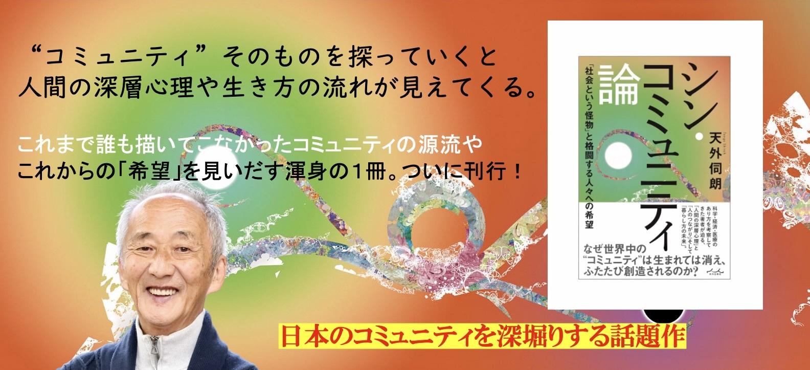 天外塾事務局(所在地:神奈川県茅ヶ崎市、代表:岡)は、新刊『シン・コミュニティ論』(著者:天外伺朗、出版社:株式会社内外出版社/台東区)を2024年9月25日(水)に発売します。また8月8日よりAmazonにて予約受付を開始いたしました。9月15日(日)~16日(祝・月)には刊行記念イベントを八ヶ岳のリトリートドームOR(山梨県北杜市)にて開催します。