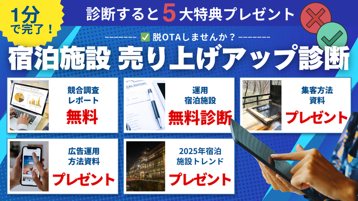 行う株式会社Dot Homes(以下Dot Homes)は、宿泊施設の経営課題を可視化し、最適な成長戦略を提案する「脱OTA!宿泊施設売上診断」の無料提供を開始しました。簡単な質問に答えるだけで、施設の現状を5つの成長タイプから診断し、具体的な改善アクションプランを提示します。