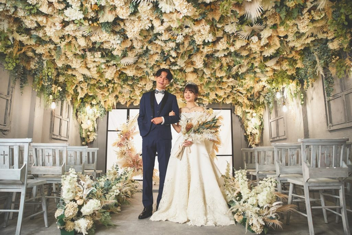 天井には2万本以上のお花が敷き詰められ、ドライフラワーやアンティーク家具が並ぶ「アンティークチャペル」をテーマとした圧巻の空間です。