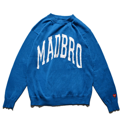 パッと目を惹くブルーのニット地に、ヴィンテージ風カレッジロゴが映える1枚。