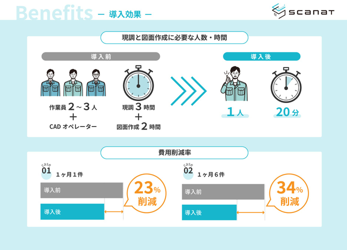 今回リリースした新機能(バージョン1.0.3)では、Scanatで作成した3Dモデルの平面図化を行う「図面作成機能」を追加しました。これにより、現地調査から図面作成に掛かっていた人員・時間・費用の削減が可能になり、提案に費やす時間の確保や顧客満足度の向上に繋がります。