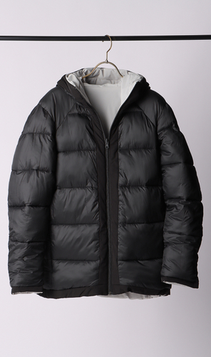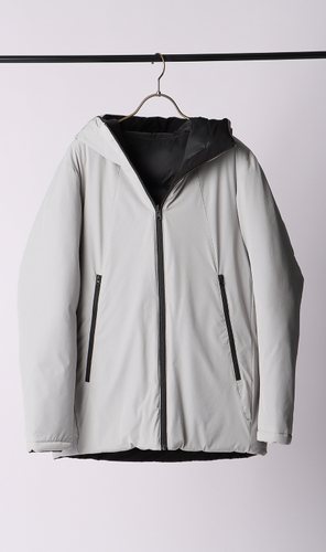 また、デザインはシンプルなショート丈フーテッドコートで、裏側がカジュアルなキルト仕様となっており、リバーシブルコートとして着用ができます。カラーは、マットで落ちつきのある質感のブラック・ネイビー・グレー・ライトグレー・ベージュの5色展開で、裏側は全色、適度な光沢があるブラックとなっています。その日の気分やコーディネートに合わせて変えることのできるリバーシブル仕様と豊富なカラー展開で、男性でも女性でも着回しやすい高機能コートです。