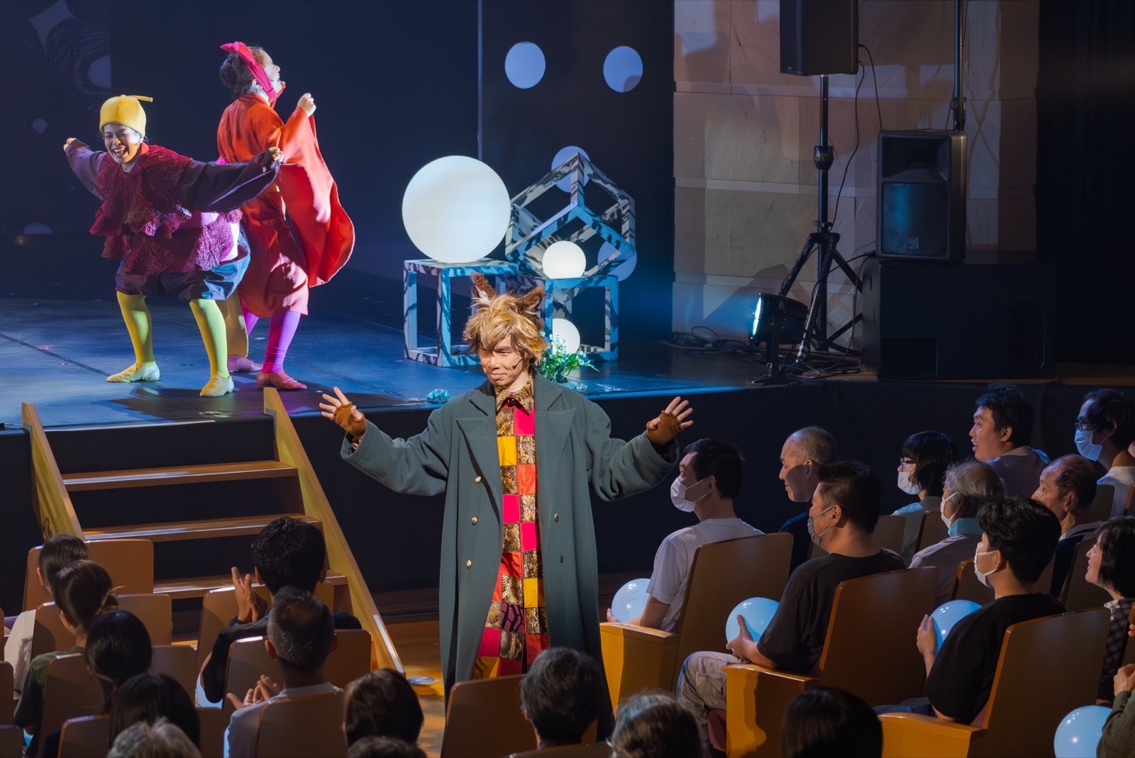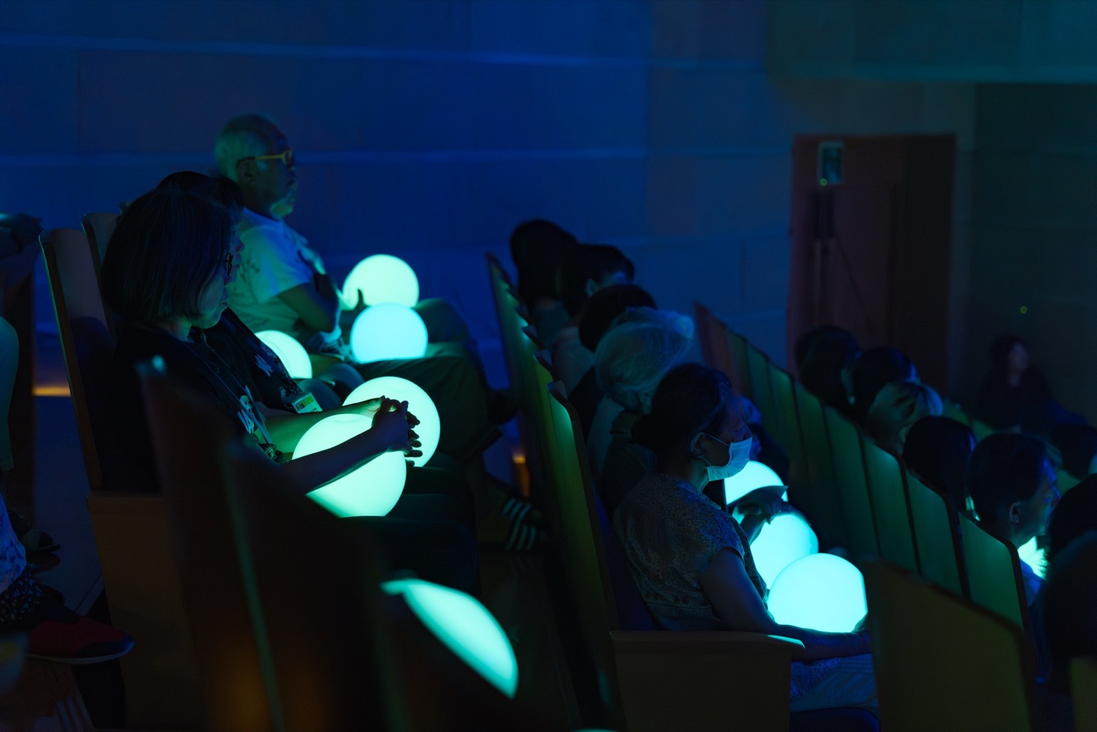 イーハトーブシアターの特色の一つは、観客がドラマの変化に呼応して色を変えて光るボールをハグしながら観劇すること。舞台と客席の境界をなくすデジタルアートによる演出で、観客自身が舞台の一部となり、これまでにない観劇体験を生み出します。花巻市での初演公演のカーテンコールでは客席いっぱいに揺れる光るボールが新しいコミュニケーションのカタチを生み出しました。