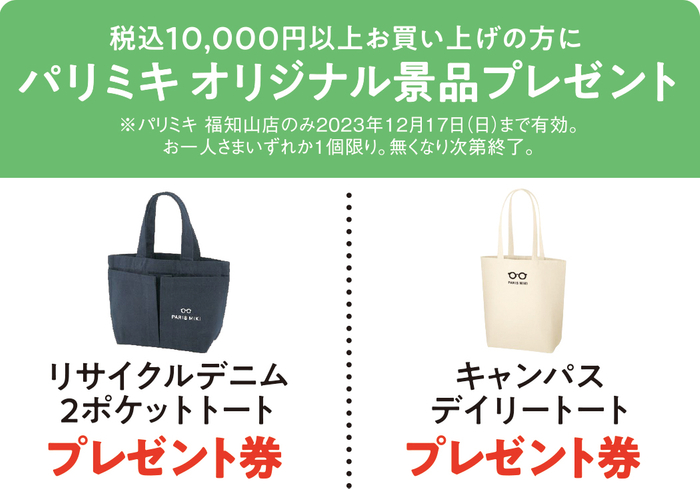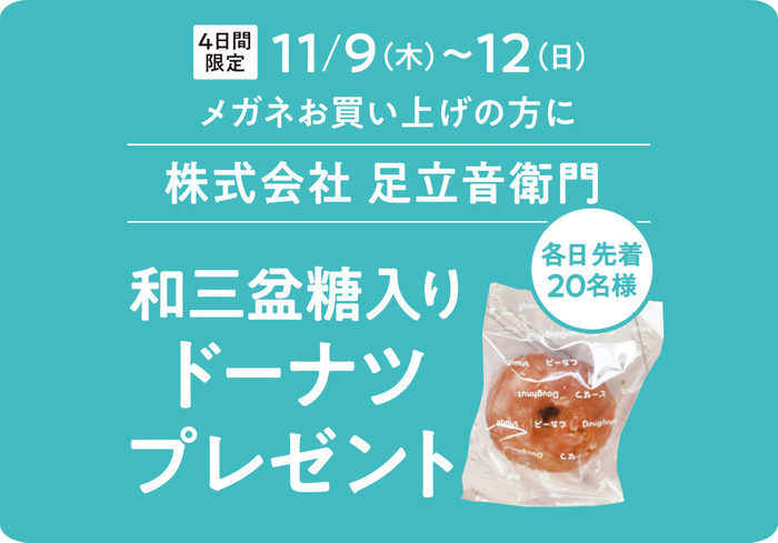 オープンを記念し、11/9(木)~12(日)の4日間、各日メガネをお買い上げの方 先着20名様に足立音衛門「和三盆入りドーナツ」をプレゼント! また、期間中 税込10,000円以上お買い上げの方に、パリミキオリジナルトートバッグをプレゼント!※無くなり次第終了となります。