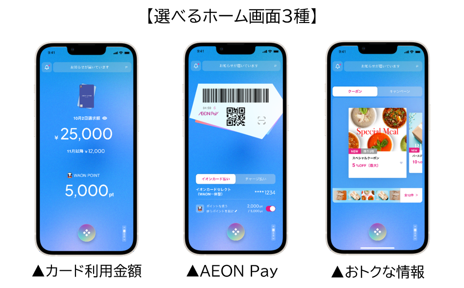 このたびのリニューアルにより、イオンカードをお持ちでないお客さまも「イオンウォレット」にご登録いただくことで、「AEON Payチャージ払い」「クーポン」「キャンペーン応募」等の機能をご利用いただけるようにいたしました。さらに、デザインはシンプルで見やすく、クーポンやキャンペーンの画面も探しやすいよう操作性と視認性を向上させるとともに、一人ひとりの利用したい機能に応じてホーム画面の選択・カスタマイズを可能といたしました。