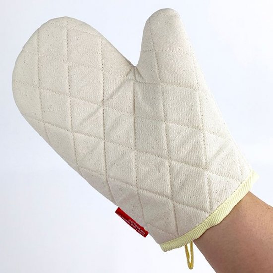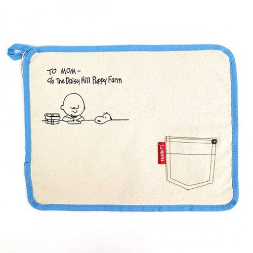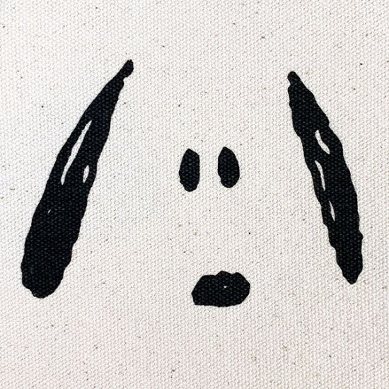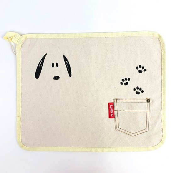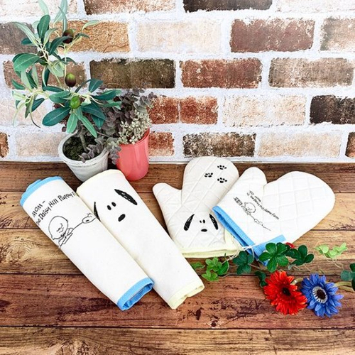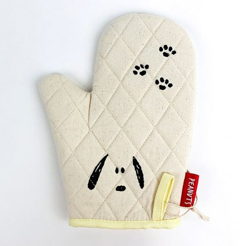 アイボリーの綿素材に、フェイスデザインのスヌーピーのイラストがかわいいキッチンミトンです。足跡のイラストもあってキュートですよね。