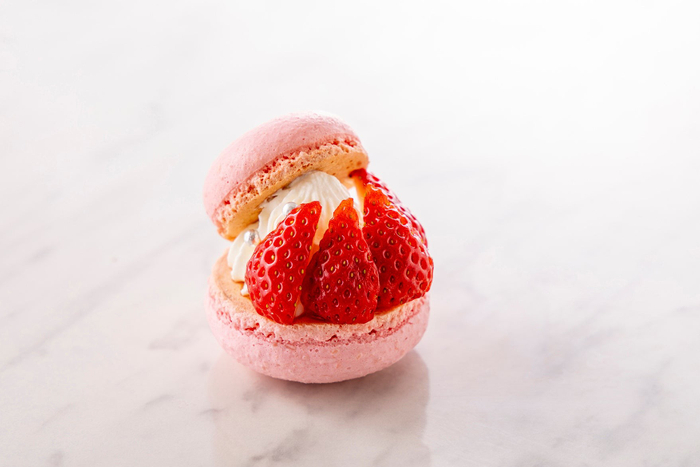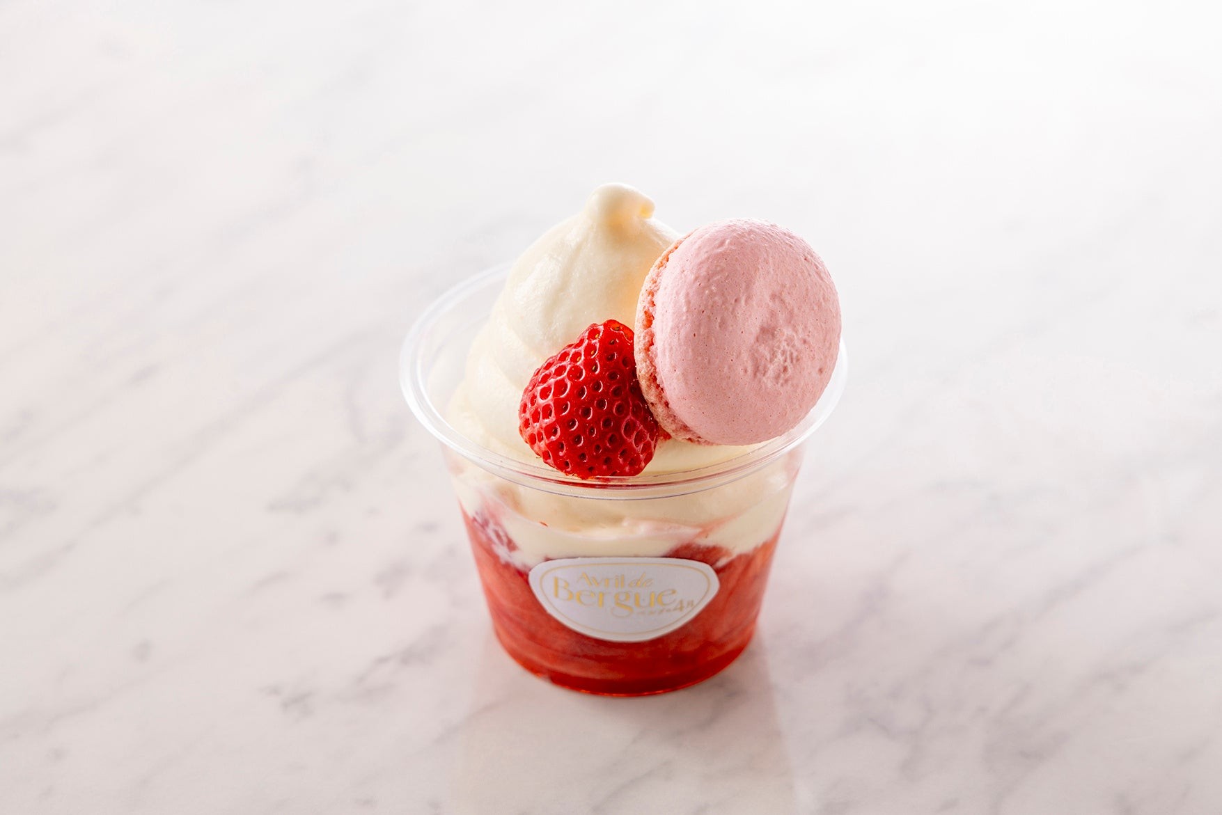 ぷるぷるいちごゼリーと国産いちごたっぷりの特製パフェ。ミルキーでさっぱりとした甘さの自家製ソフトクリームで仕上げました。サクサクとした木苺マカロンの食感が良いアクセントに。