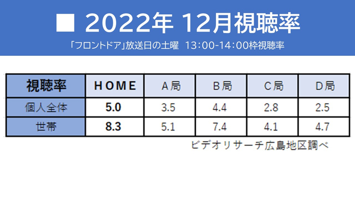 (※)「フロントドア」放送日の(土)1300-1400枠視聴率