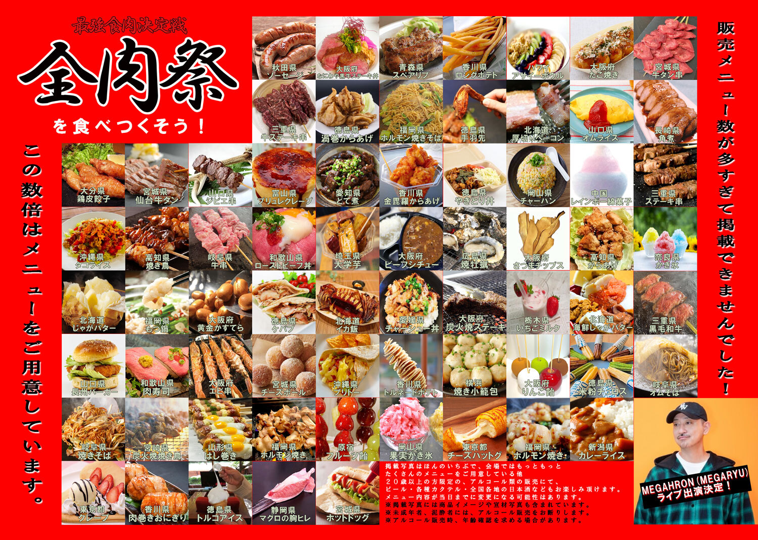 畜産肉料理はもちろん、魚肉や果肉などあらゆる肉をテーマとして全国を対象に出店を募集・選考し、各地の美食が集う西日本最大級の野外グルメイベントです。