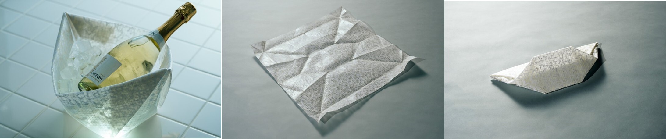 晴れた日に外で冷えたワインを飲むひととき、ワインクーラーはかさばるため気軽に持ち歩けません。そこで人の体温付近の温度で柔らかくなり、冷やすと硬くなるHUMOFIT(TM)の特長に着目し、収納時は1枚のシートでありながら、使用時は折り紙を折る要領で立体にし、氷水を入れることでカタチを保持するといった新しい発想のワインクーラーを作りました。表面には日本伝統技術の和紙を貼り合わせたことで、独特の質感としなやかさがあります。和紙の透け感が、屋外での佇まいをより一層引き立たせます。