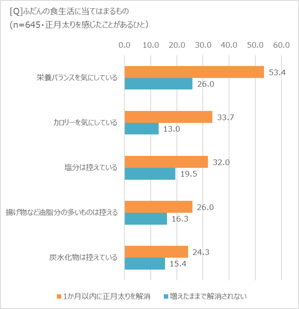 「正月太り」の原因をさらに掘り下げてみると、「年々、正月太りを解消できず体重が増えつづけている」と回答した人は、1カ月以内に解消した人と比べて「正月太りの原因」として回答した項目数が圧倒的に多いことが判明。特に多かったのは、クリスマスや正月のごちそう、連日の外食、飲み会、お菓子やお酒のとりすぎなど。しかも、年末年始だけでなく、ふだんの食生活でも、栄養バランスやカロリー、塩分を気にしている割合が低く、揚げものなど油脂分が多いものを控える割合も低い傾向が。どうやら、正月太りが解消できなくなっているのは、年末年始だけでなく、日ごろの食生活にも原因がありそうです。
