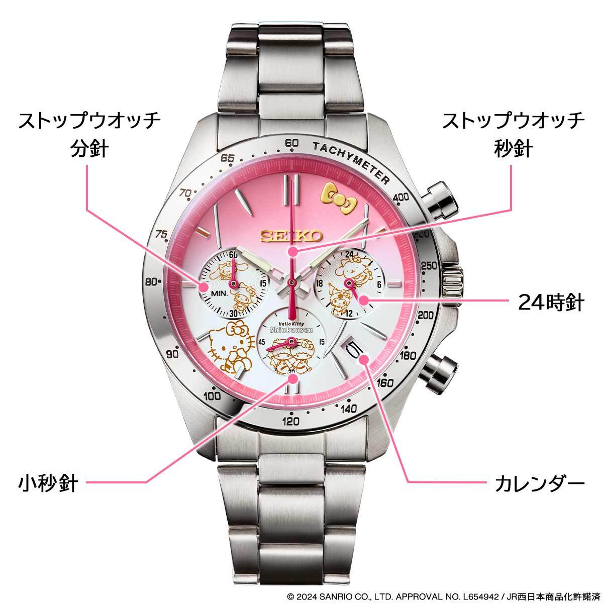文字盤はハローキティ新幹線の車両カラーにちなんだピンクと白のグラデーションカラー。500系新幹線の象徴であるロングノーズを模した放物線が3つのインダイヤルを結んでいます。