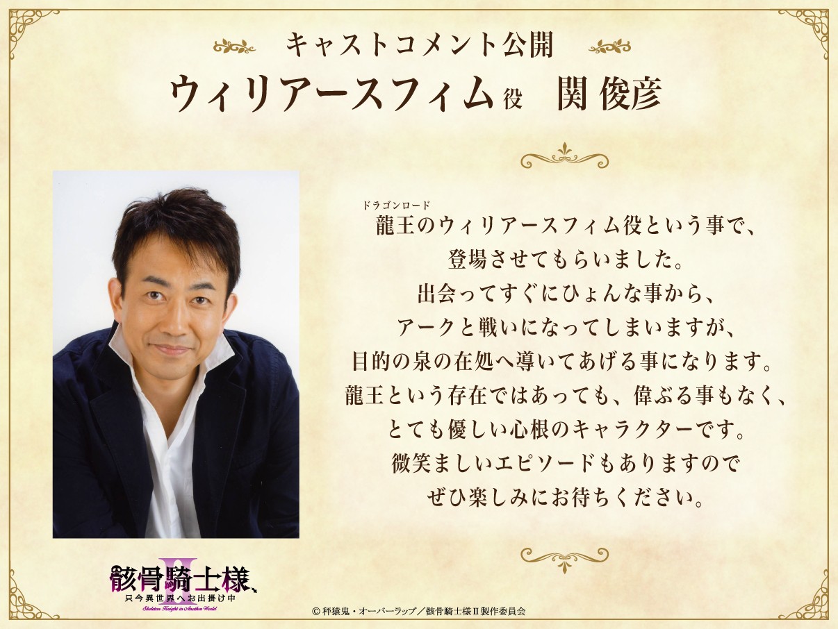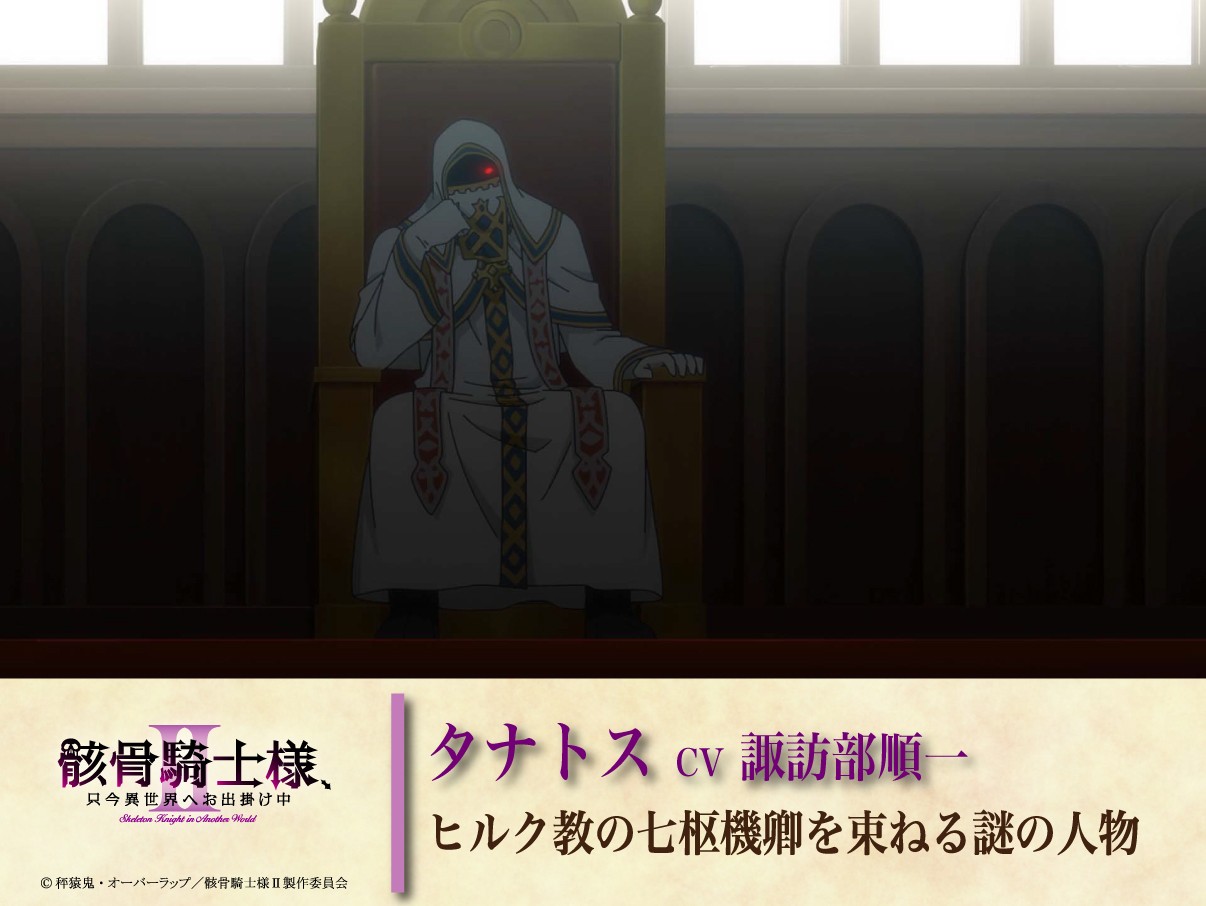 オーバーラップノベルスより刊行の「骸骨騎士様、只今異世界へお出掛け中」(著:秤猿鬼、イラスト:KeG)は、シリーズ累計(紙+電子)350万部突破の大人気作品です。MMORPGプレイ中に寝落ちしてしまい、目覚めると自身が使用していたゲームキャラの姿で、見知らぬ異世界に放り出されていた主人公の「アーク」。その姿は見た目が鎧、中身が全身骨格という〝骸骨騎士〟であり、それ故モンスターとして討伐されぬよう目立たず異世界を楽しもうと決意するのですが、お人好しのために目の前の悪事を見過ごせずに成敗を繰り広げてしまうという、爽快世直し異世界ファンタジーとなっております。今年7月より放送となるTVアニメ第2期の本PVがいよいよ公開となり、アークたちの旅路の先に、新たなる敵が立ちふさがる予感を感じさせる内容となっています。アークの呪いを解く鍵になるかもしれぬ泉の前に立ちふさがる龍王・ウィリアースフィム役を関 俊彦、チヨメと同じく獣人族の忍者であるサスケ役を小野賢章、ツボネ役を上田 瞳、エルフや獣人を排斥する宗教団体であるヒルク教の七枢機卿・パルルモ役を赤羽根健治、バルトード役を四宮 豪、その七枢機卿を束ねる謎の人物・タナトス役を諏訪部順一が演じることもPVで解禁となりました。さらに、関 俊彦、小野賢章、上田 瞳、諏訪部順一からのコメントも併せて公開となりました。