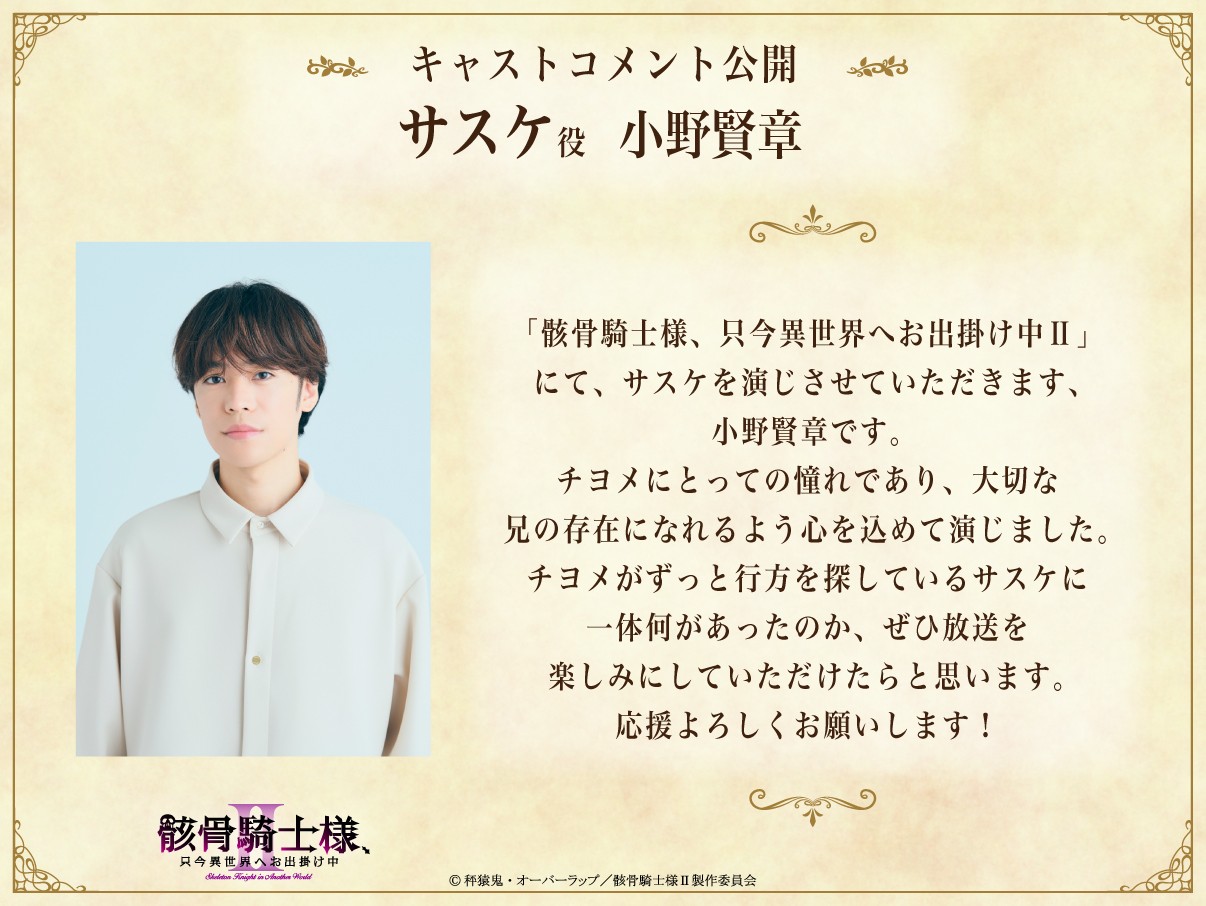 「骸骨騎士様、只今異世界へお出掛け中Ⅱ」にて、サスケを演じさせていただきます、小野賢章です。チヨメにとっての憧れであり、大切な兄の存在になれるよう心を込めて演じました。チヨメがずっと行方を探しているサスケに一体何があったのか、ぜひ放送を楽しみにしていただけたらと思います。応援よろしくお願いします!