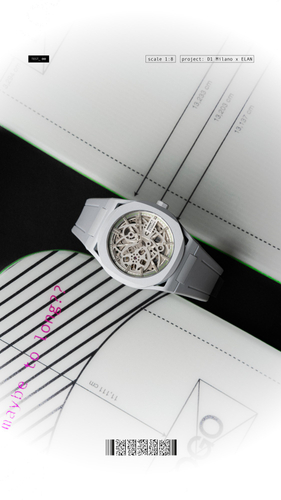 本コラボレーションは、Elan がスキーの概念を革新してきた先鋭的な設計思想と、D1 Milano が追求するミニマリズムが交差したプロジェクトです。スキーと時計。ジャンルは異なれど、「余白を削ぎ落とし、本質だけを際立たせる」という理念はひとつ。ここでの透明性は、単なるデザインテーマではなく、構造・素材・精度を“見せる”ための言語です。軽量かつシャープなドリルケース、角度を強調するオープンワーク構造、奥行きを持たせたマットホワイトのスケルトンダイヤル。視覚からも触感からも“メカニカルな本質”を感じられる設計となっています。