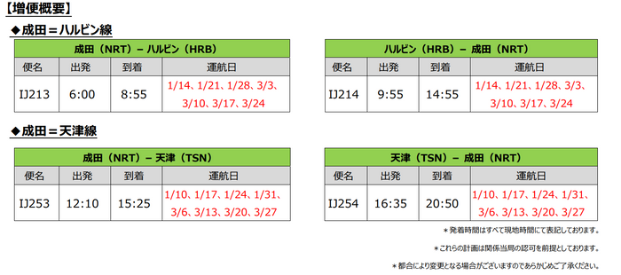 スプリング・ジャパン 2024年1月および3月の成田=ハルビン線、成田=天津線増便について スプリング・ジャパン株式会社 2023-10-26 13:00 JALグループのLCCであるスプリング・ジャパン株式会社(以下:スプリング・ジャパン)は、このたび、2024年1月および3月の成田=ハルビン線、成田=天津線において増便を決定し、本日15時より販売を開始します。これにより、成田=ハルビン線、天津線、寧波線は2023年冬ダイヤ期間中、毎日運航となります。 運賃およびダイヤの詳細につきましては、スプリング・ジャパン公式サイトをご覧ください。 SPRING JAPAN公式サイト - 格安航空券の予約検索 SPRING JAPAN公式サイトでは毎日リーズナブルな価格の航空券を予約できるほか、割引セール情報も常時ご提供しています。さっそく特典チケットをチェックしましょう。格安チケットの購入はウェブサイトだけではなく、スマホサイト、コールセンターも気軽にご利用ください。 https://jp.ch.com/ ジャンル: 旅行・お出かけ 画像一覧 一括ダウンロード