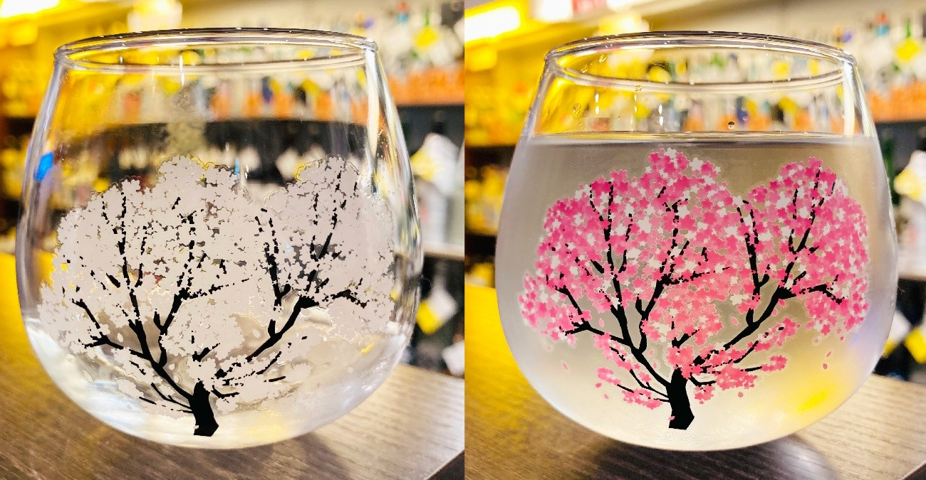 グラス付きの前売り飲み比べチケットにお付けするグラスは、冷たいお酒を注ぐと桜が色付くサケコレオリジナルロゴ付きのスペシャルグラスです。
