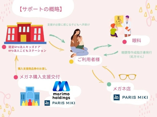 認定NPO法人キッズドア、NPO法人こどもステーションが、「見えにくさ」を感じている子どもたちへ声掛けを実施し、ニーズを確認します。眼科医にて処方せんを取得後、近隣のパリミキでメガネを購入。メガネの購入代金(商品券)は株式会社マリモホールディングスとパリミキから支援されます。