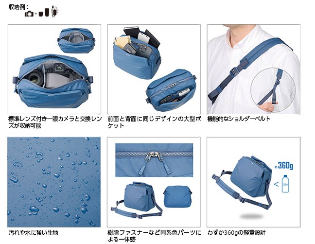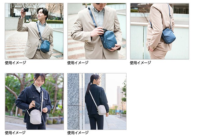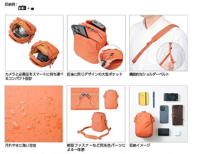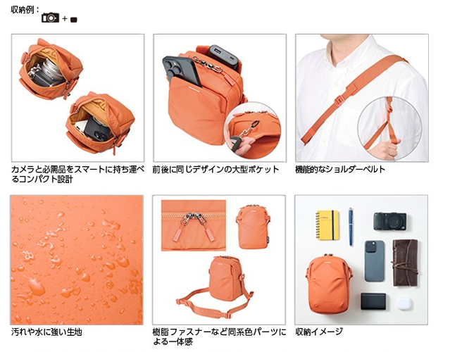 小型ミラーレス一眼やスマートフォンなどを軽快に持ち運べるコンパクトモデルです。前面と背面には普段使いにも便利な大型ポケットを装備。日常に馴染むミニマルなデザインで、ちょっとしたお出かけや旅先でのサブバッグとしても活躍します。