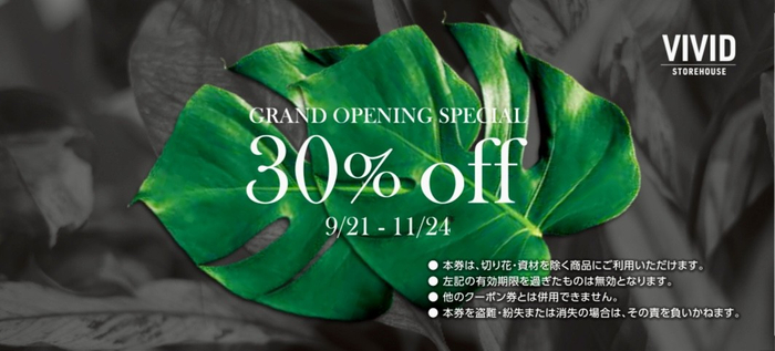 オープンを記念して、店内の観葉植物を対象としたクーポン割引を実施します。2024年9月21日(土)から11月24日(日)までの期間中、初回来店時のご購入から店頭表示価格より30%にあたる金額を割引します。ぜひこの機会にお得にお買い物をお楽しみください。