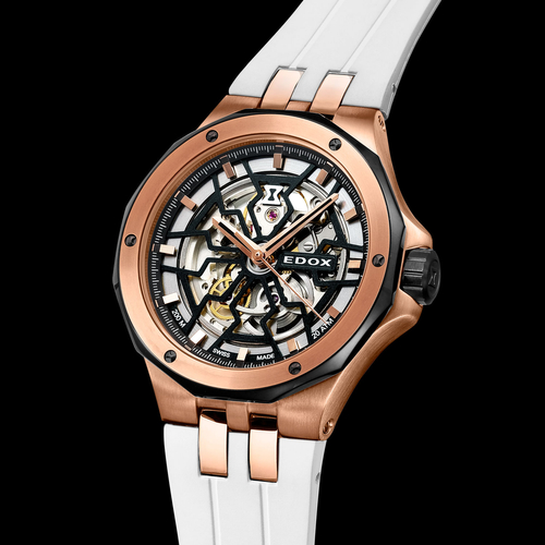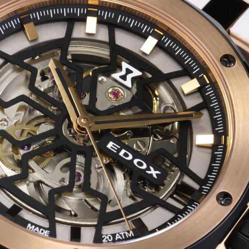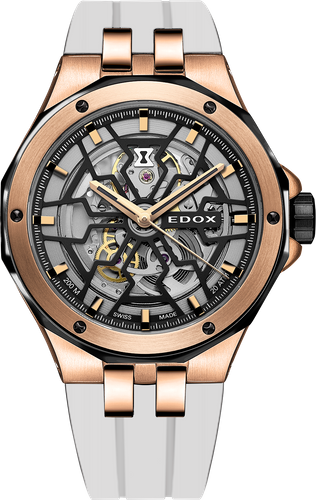 きらびやかなゴールドPVD仕様のステンレススティールケースに搭載したスケルトンダイアルに、エドックスのエンブレムに用いられている砂時計をモチーフとしたカットワークをデザイン。あらわになったスイス製機械式ムーブメントとシンクロし、緻密な建築物のような構造美を感じさせます。