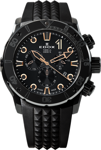 エドックスのフラッグシップコレクションであるクロノオフショア1をブラック&ゴールドにカラーリング。高級な黒漆の外壁、権威を示す金箔瓦、金の鯱を持ち、「金烏城(きんうじょう)」とも呼ばれる岡山城の昼の姿をイメージした特別仕様です。