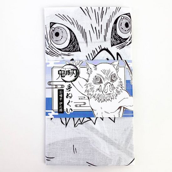 3つ目は、嘴平伊之助の手ぬぐいをご紹介します。サイズは同じく35×100cmです。伊之助のトレードマークであるイノシシが私たちをひきつけますね♪