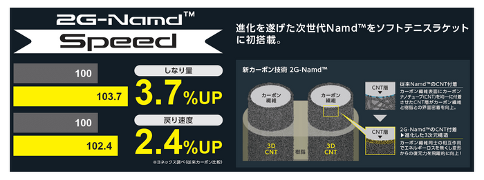 強靭なしなりと急激な復元力を生む「Namd™」がさらに進化し、変形からの復元力が飛躍的に向上した「2G-Namd™ Speed」をソフトテニスラケットに初搭載。高次元のしなり戻りが「さらなる弾き」と「高速レスポンス」を生みます。