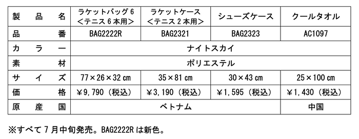 ラケットとデザインを連動させたバッグとタオルとのトータルコーディネートをお楽しみいただけます。