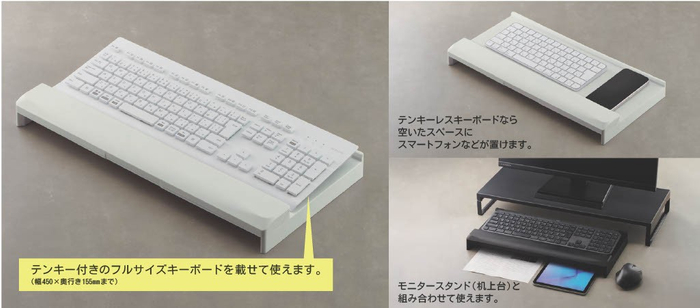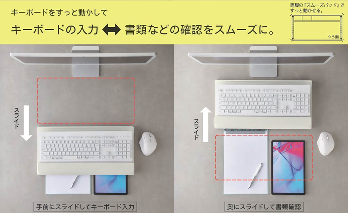 キーボードスタンドの下のスキマには、書類やノートなどを置くことが可能。書類を覆うようにキーボードスタンドを手前にスライドすると、書類を動かさずスムーズに「キーボードの入力作業」に切り替えることが可能。キーボードスタンド下のスキマには、A3用紙や冊子(見開きA3サイズ)が入る。キーボードスタンドの両足には、スライドしやすいテフロンシートの「スムーズパッド」付き。
