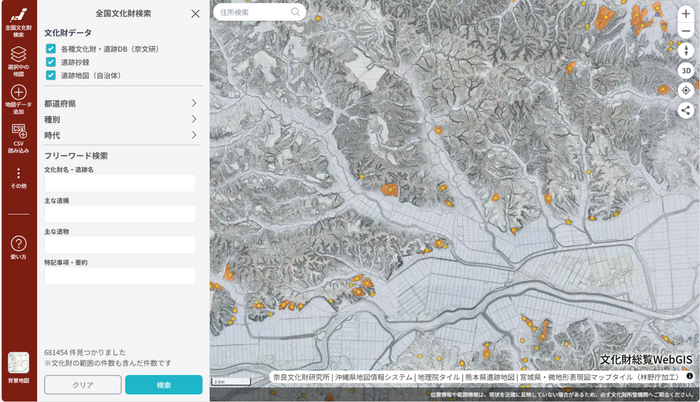 左サイドバーの「地図データ追加」-「地図」-「土地の凹凸」にある「宮城県・微地形表現図マップタイル(林野庁加工)」「神奈川県・微地形表現図マップタイル(林野庁加工)」「静岡県・微地形表現図(CS立体図)マップタイル(林野庁加工)」にチェックを入れ、表示順および透過度をご調整ください。