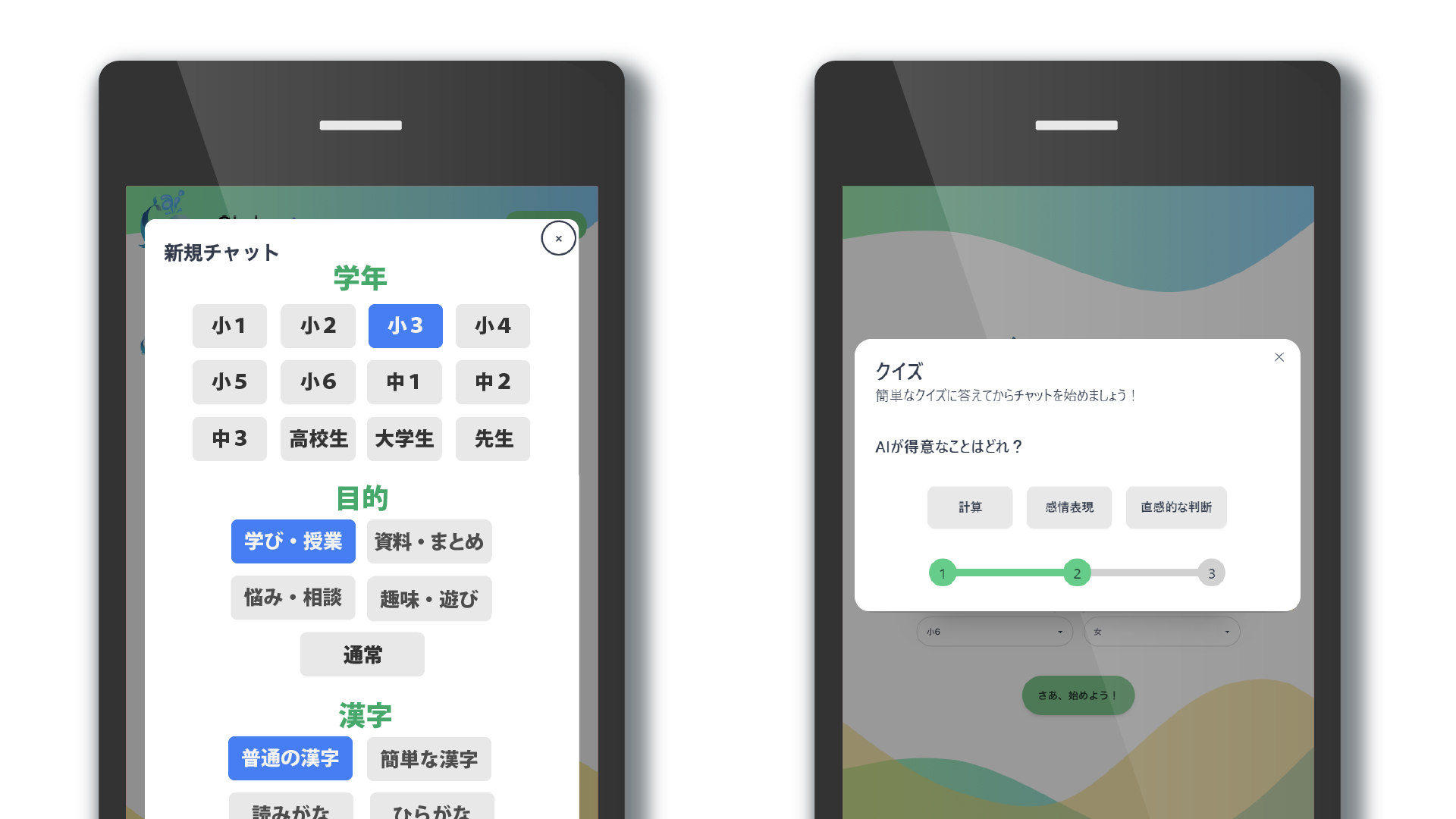 小学校低学年から中学生まで、学習内容や興味関心の違いを考慮し、発達段階に応じた理解しやすい言葉遣いで回答を提供します。高校生・大学生にも対応しています。また、ひらがなのみの回答や読み仮名をつけることも簡単な選択で可能です。