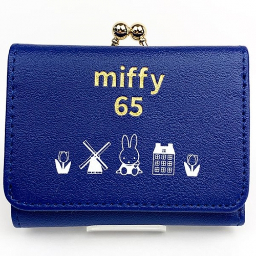 お馴染みの三つ折り財布にも、65周年グッズが登場です。こちらはシックなネイビーに、白いプリントのミッフィーたち。上には65の文字も♪