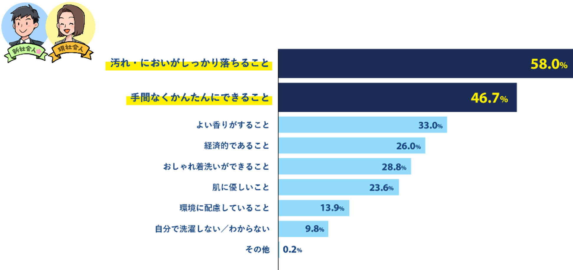 白い服も「自宅でケア」する人が多くいたことがわかりました。そこで、洗濯に対して、重要視していることについてたずねたところ、約半数の方が「汚れ・においがしっかり落ちること(58%)」「手間なくかんたんにできること(46.7%)」と回答しました。