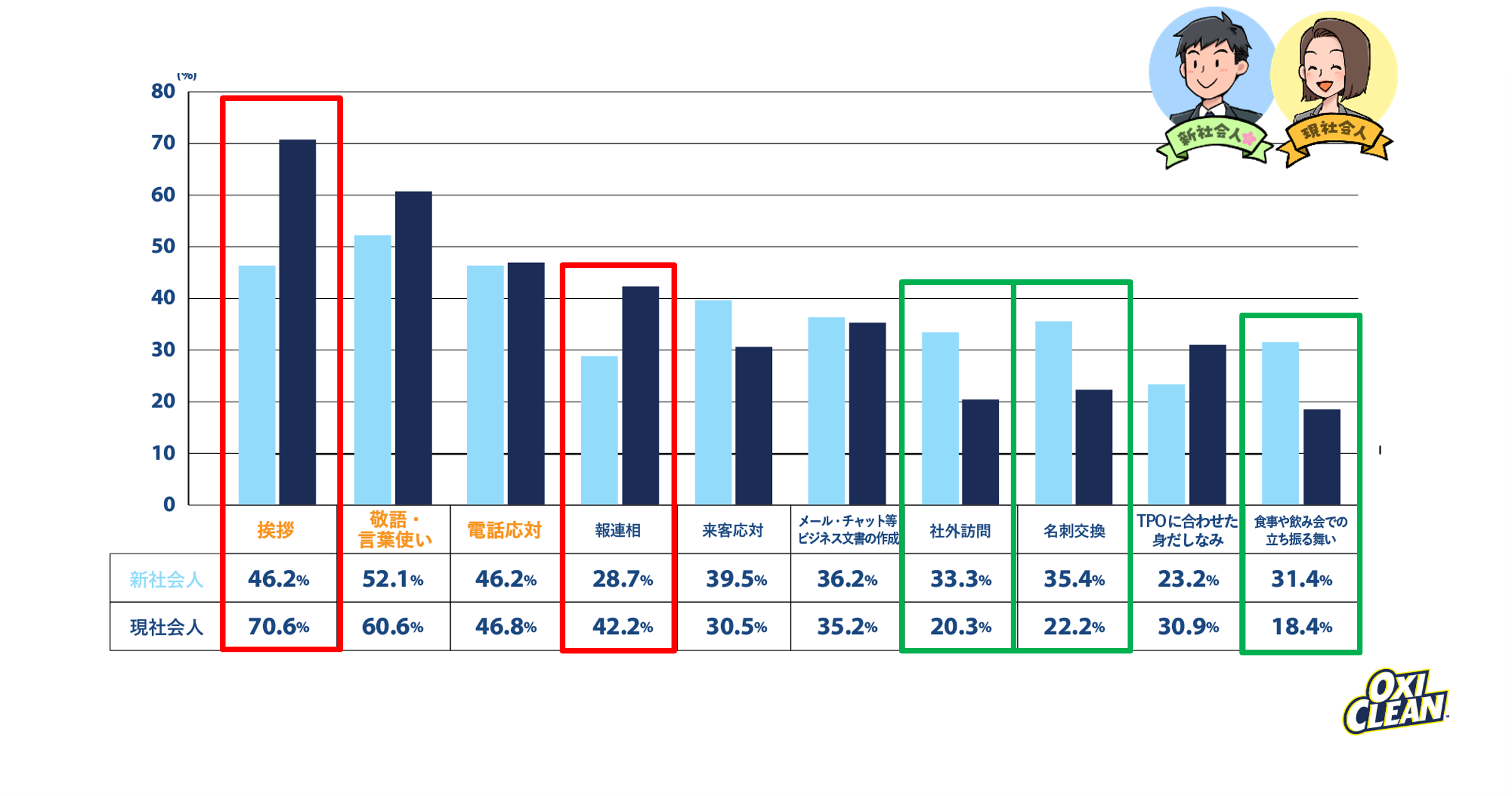 その結果、新社会人は全てまんべんなく心配ということがわかりました。それぞれ1位となった回答は、新社会人で「敬語・言葉使い(52.1%)」、現社会人は「挨拶(70.6%)」となりました。