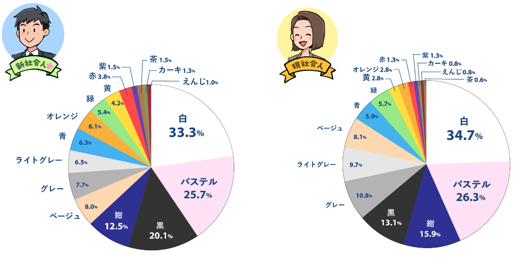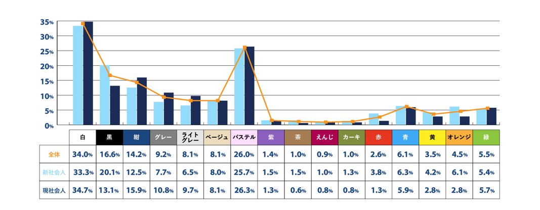 新生活をイメージする色をたずねたところ、全体で34.0%の人が「白」と回答し第1位となりました。次いで「パステルカラー(26.0%)」が選ばれ、爽やかで明るい春を連想する人が多いことがわかりました。新社会人と現社会人をそれぞれ円グラフで比較してみると、大差はないものの、新社会人はベーシックな色をはじめ、現社会人よりも「青」「オレンジ」などビビットな色味にも票が多く入り、多様に分布している傾向がわかりました。