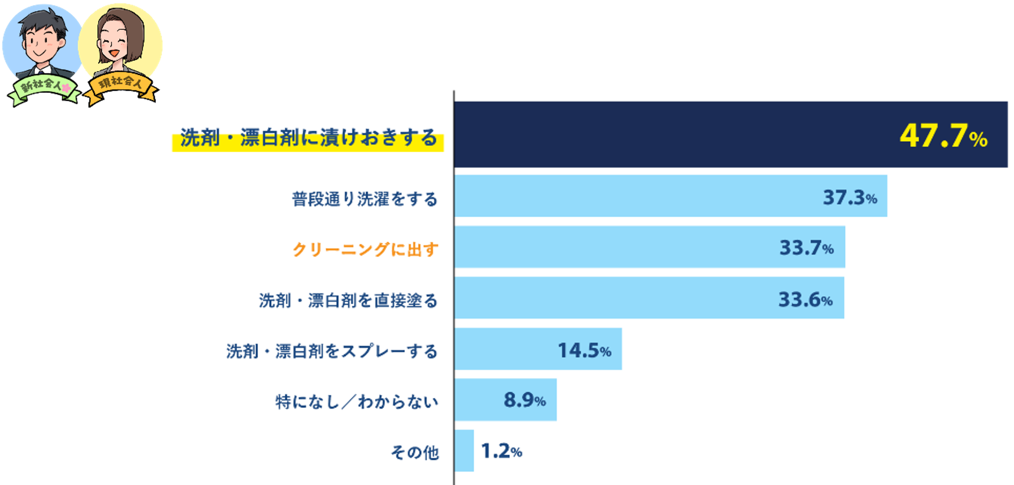シミや汚れのケアについては、「クリーニングに出す(33.7%)」をおさえ、「洗剤・漂白剤で漬けおきする(47.7%)」が最多となりました。