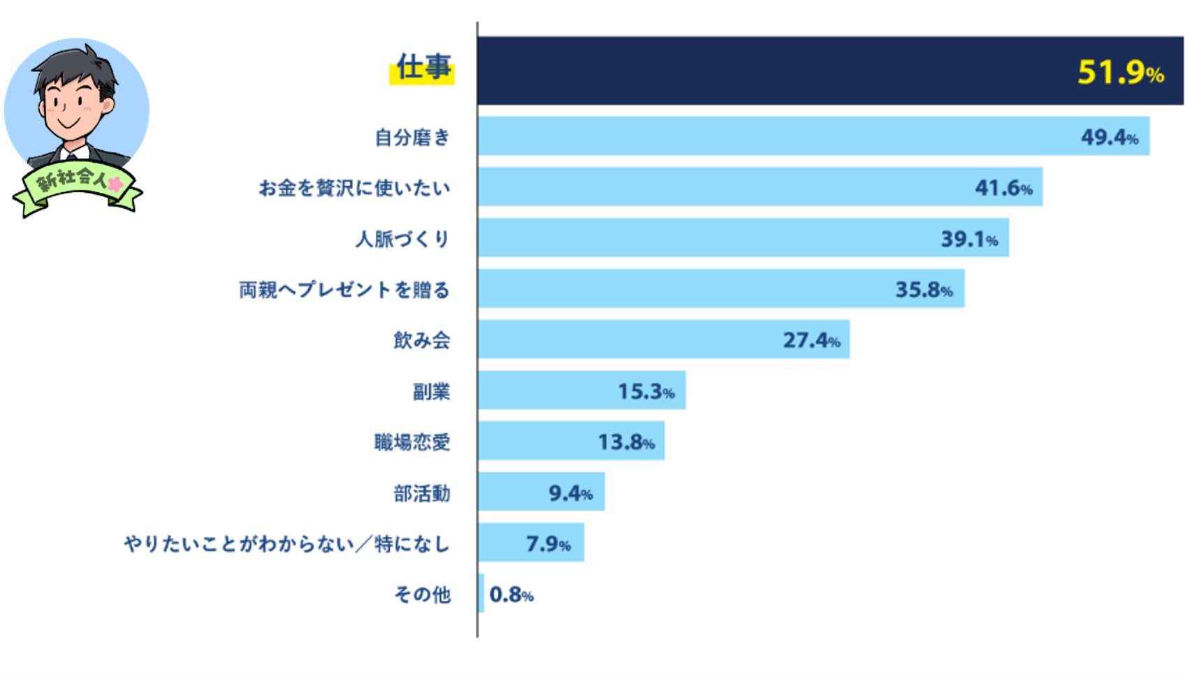 ・社会人になってやりたいこと、最多は「仕事(51.9%)」