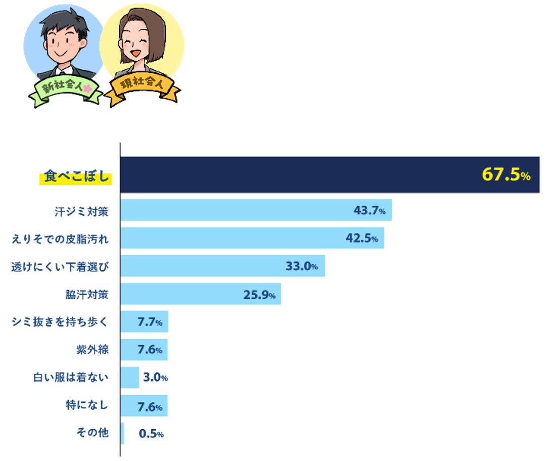 白い服のケアで困ったことはあるかたずねたところ、68.1%が「ある」と回答しました。白い服を着るときに気を付けていることをたずねたところ「食べこぼし(67.5%)」が断トツで1位となり、次いで、「汗染み対策(43.7%)」「えりそでの皮脂汚れ(42.5%)」と続き、白い服だからこそ目立ってしまう日々の汚れが上位にランクインしました。