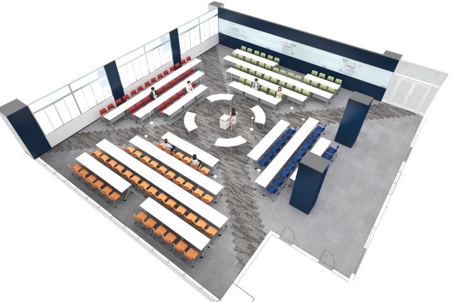 既存の固定パソコンを撤去し、アクティブラーニングに対応した教室にリニューアルします。対話形式の授業に適したレイアウトとして、教室の中央に講師が立つためのセンターステージを配置し、学生と教員との距離を縮めてコミュニケーションを促進し、積極的な学びを促すことを目的としています。また、収容人数を80人から134人に増やし、従来2つの教室に分かれて行っていた授業を1つの教室で行うことが可能になりました。