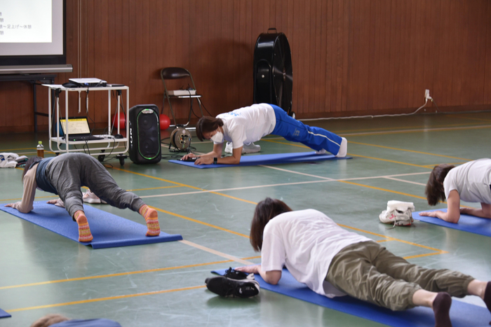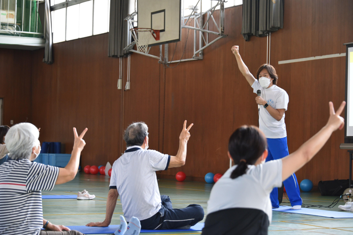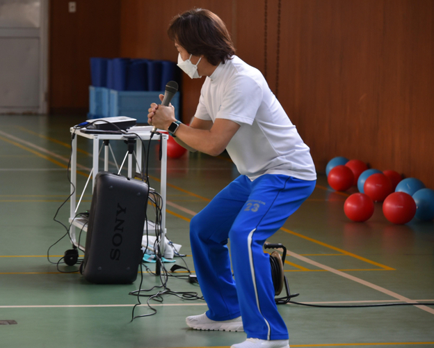 受講者は「優しいトークで楽しかったです」「後で筋肉痛になりそうですが、よく体を動かすことができました」と満足そうでした。佐藤特任教授は「年齢を重ねていくと下半身が大事になってくるので、体幹を中心にあえてきつめの内容にして指導しましたが、参加した皆さんは健康運動の動きに慣れていて安心してできました」と振り返っていました。