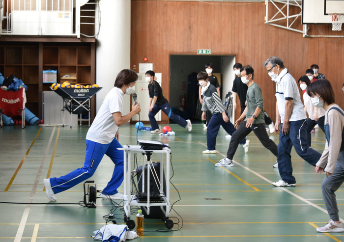 佐藤特任教授は体をほぐすジャンプから始まり、屈伸や首回しなどのストレッチを自ら体を動かしながらお手本を示して指導し、「柔軟体操は『痛気持ちいいぐらいで』」などとアドバイス。さらに健康づくり教室などでの注意点として「参加者を笑顔で迎えましょう」「さりげなく顔色をチェックしてください」といった点を挙げていました。
