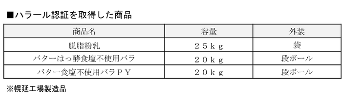 このたびのハラール認証取得は、当社が進める「アジア地域での販売強化」「国産乳製品の販路拡大」の一環の取組みであり、東南アジア諸国におけるハラールマーケット向け商品に使用する原材料としての輸出促進を目的としています。