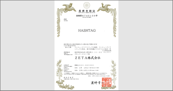 ECキュレーション・ハッシュタグ・レビュー・EC商品検索・OMOソリューションを開発販売するコマースとCXのリーディングカンパニーであるZETA株式会社(本社:東京都世田谷区、以下ZETA)は、『HASHTAG』の商標登録が完了したことをお知らせいたします。