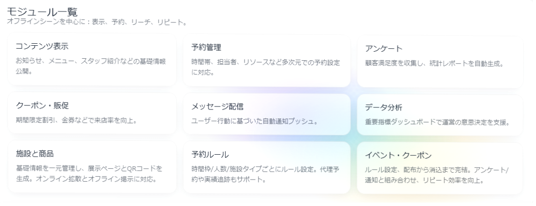 商品・施設管理、予約、イベント、クーポン、アンケート、通知などの高頻度業務を、標準化された設定可能なモジュールとして統合。